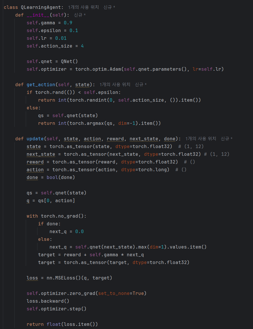 계속해서 방금 작성한 신경망을 이용하여 Q 러닝 알고리즘을 구현해보자.