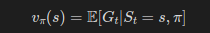 상태 S_t가 s이고(시간 t는 임의의 값), 에이전트의 정책이 pi일 때, 에이전트가 얻을 수 있는 기대 수익을 다음처럼 표현할 수 있다.