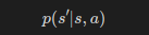 여하튼, 에이전트가 상태 s에서 행동 a를 선택한다고 해보자. 이 경우 다음 상태 s'로 이동할 확률은 다음처럼 나타낸다.