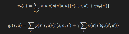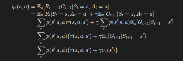 또한, 상태 가치 함수와 행동 가치 함수 간의 관계를 이용하면 다음과 같이도 표현이 가능하다.