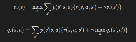 물론 최적 정책도 벨만 방정식을 만족하고, 게다가 정책이 '최적이다'라는 성질을 이용하면 벨만 방정식을 더 간단하게 표현할 수 있다.