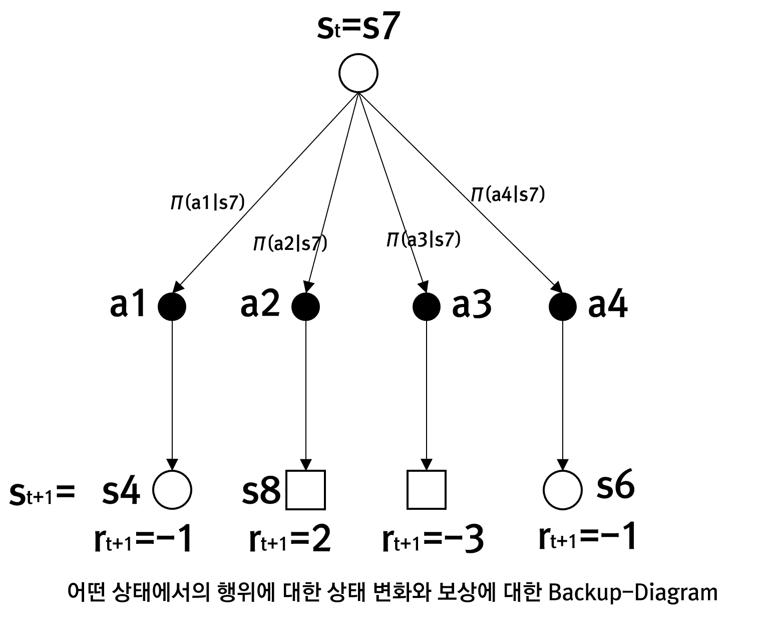 백업 다이어그램은 '방향 있는 그래프'를 활용하여, '상태, 행동, 보상'의 전이를 표현한 그래프이다.