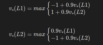 두 칸 짜리 그리드 월드처럼 단순한 문제라면 벨만 최적 방정식을 직접 손으로 계산하여 풀 수도 있다.