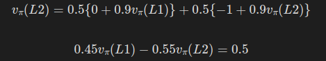 - v_\pi(L1)=-2.25 는 L1에서 시작해 pi 를 계속 따르면 장기적으로 받는 할인 보상의 기대 총합이 -2.25임