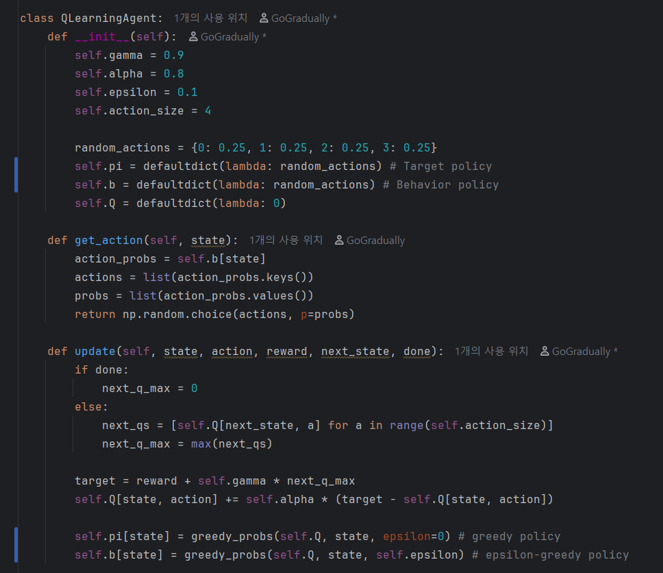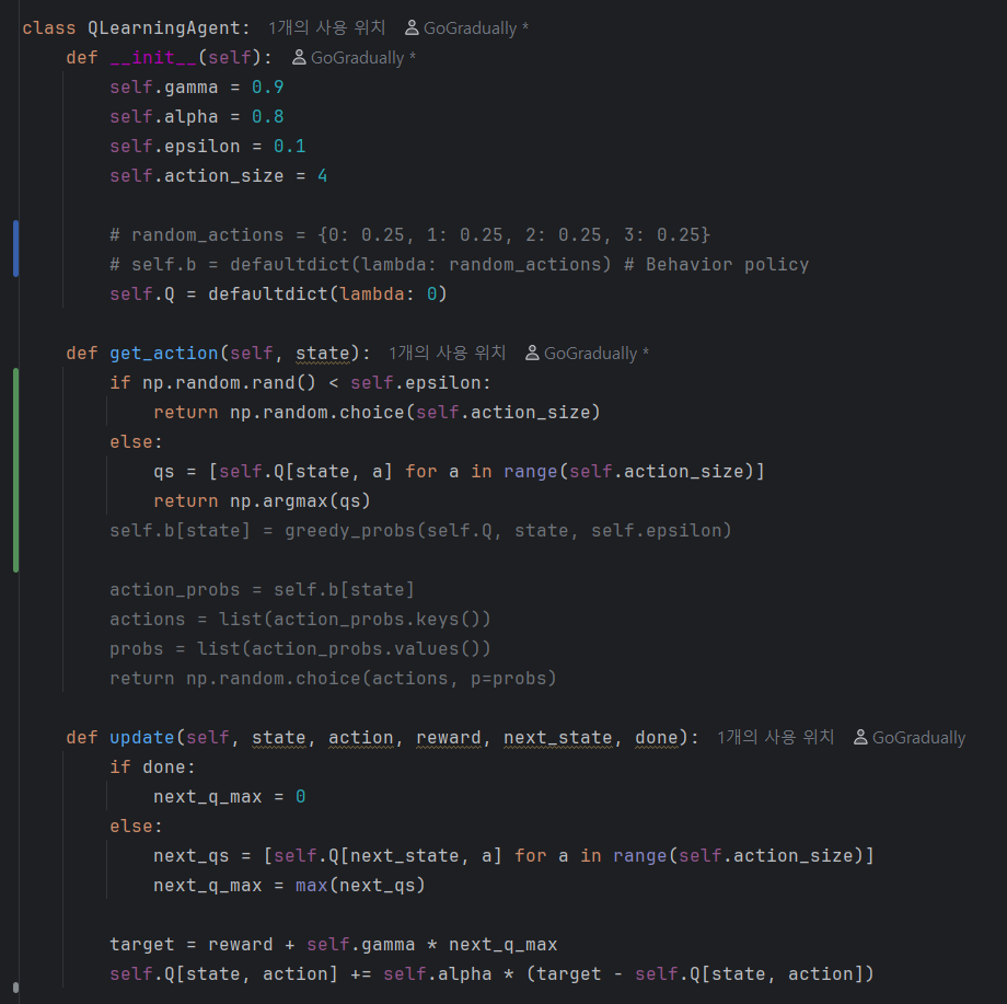 get_action() 메소드에서 self.b를 사용하지 않고, Q 함수를 이용하여 입실론-그리디 정책에 따른 행동 선택을 직접 구현했다.