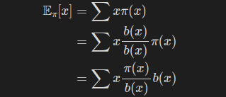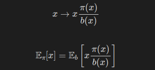 이 수식을 통해, 확률분포 pi에 대한 기댓값을 확률분포 b에 대한 기댓값으로 표현했다.