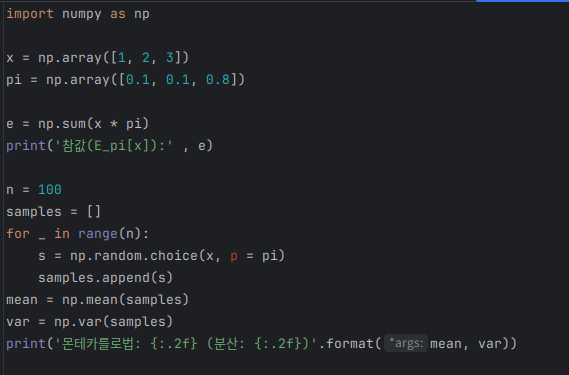 먼저 확률분포 pi의 기댓값을 일반적인 몬테카를로법(중요도 샘플링 X)으로 구해보자.