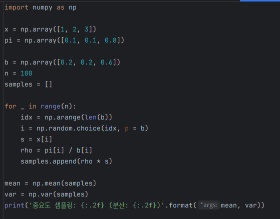 이제 다른 확률 분포 b에서 샘플링한 데이터를 이용하여 pi의 기댓값 E를 구할 수 있다.