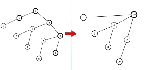 - u에서 v까지의 경로에 있는 모든 정점을 하나의 정점으로 압축한다. 즉, u에서 v까지의 경로 상에 있는 모든 정점이 트리에서 제거되고, 새로운 정점 w가 생성된다.