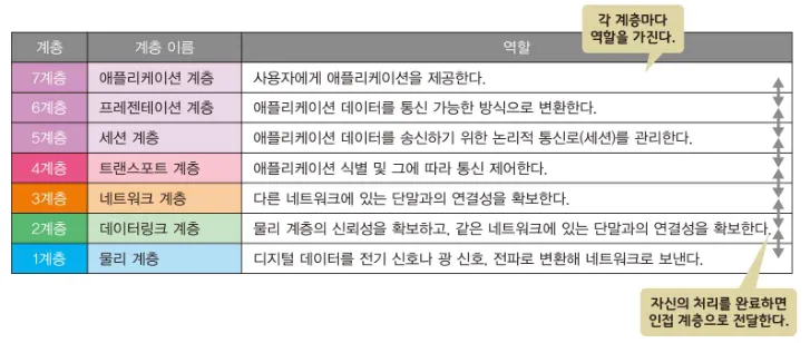 - 서로 다른 계층끼리 통신하는 방법은 하단 "계층 간 동작 방식" 내용 참고