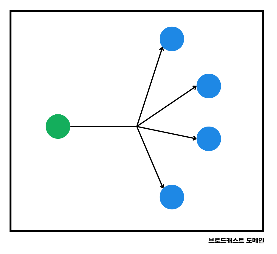 해당 브로드캐스트 도메인에 속하는 자신 외 모두와 진행하는 1:n 통신을 의미한다.
