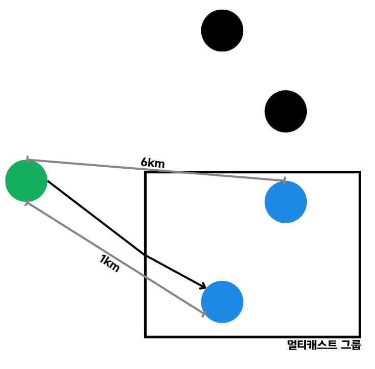 더 가까운 1km 거리의 노드에 요청을 보낸다.