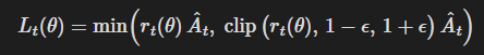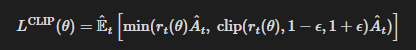 - min 내부의 두 번째 항 clip * A^t는 확률비를 클리핑하여, r_t가 구간 [1−ϵ,1+ϵ] 밖으로 벗어나려는 유인을 제거한다.