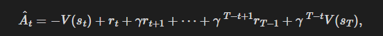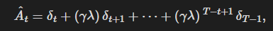 여기서 t는 길이 T인 궤적 구간 내에서 [0, T]의 시간 인덱스를 나타낸다. 이를 일반화하면, lambda=1일 때 아래 식으로 환원되는 절단형(truncated) GAE를 사용할 수 있다.