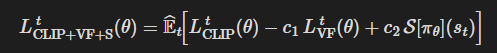 여기서 c_1, c_2는 계수이고, S는 엔트로피 보너스를 의미하며, L_t^{VF}는 제곱 오차 손실이다.