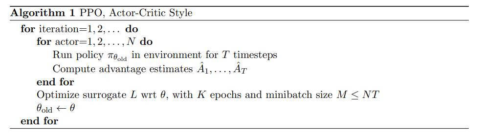 길이 궤적 구간을 사용하는 근접 정책 최적화(PPO) 알고리즘은 아래와 같다. 각 반복마다, N개의 (병렬) 액터가 T 타임스텝의 데이터를 수집한다. 그런 다음 이 NT개의 타임스텝 데이터로 대리 손실을 구성하고, 미니배치 SGD(또는 보통은 더 나은 성능을 위해 Adam을 사용할 수 있음)로 K 에폭 동안 최적화한다.