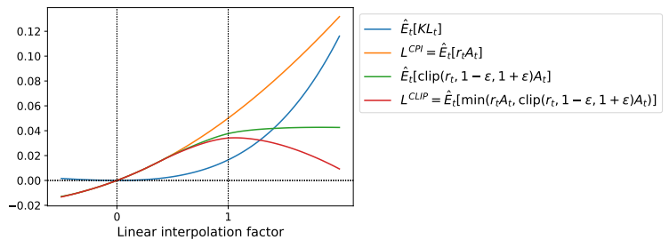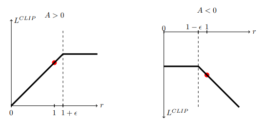 아래 그림은 L_CLIP의 단일 항(즉, 단일 t)을 그린 것으로, 어드밴티지가 양수인지 음수인지에 따라 확률비 r가 1−ϵ 또는 1+ϵ에서 클리핑됨을 보여준다.