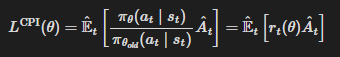 여기서 윗첨자 CPI는 이 목적함수가 제안된 보수적 정책 반복(conservative policy iteration) 을 가리킨다. 제약이 없다면 LCPI를 최대화하는 것은 지나치게 큰 정책 갱신으로 이어질 수 있다. 따라서 이제rt(θ)가 1에서 멀어지도록 만드는 정책 변화를 페널티 주도록 목적함수를 어떻게 수정할지 살펴본다.