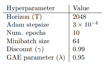 KL 패널티의 경우, 섹션 4에서 설명한 목표 KL 값 d_targ을 사용하는 적응형 계수를 쓰거나, 고정된 계수 β를 사용할 수 있다. 또한 로그 공간에서의 클리핑도 시도했지만, 성능 향상은 없었다.