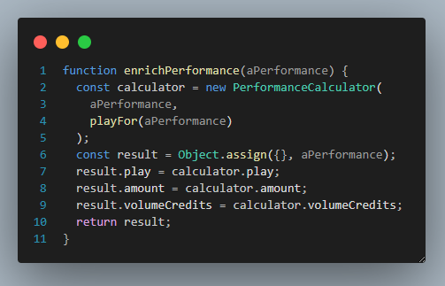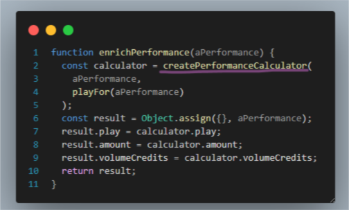 이후 enrichPerformance에 존재하는 원래 함수를 인라인(6.2절)하여 새 함수를 직접 호출하도록 하자.