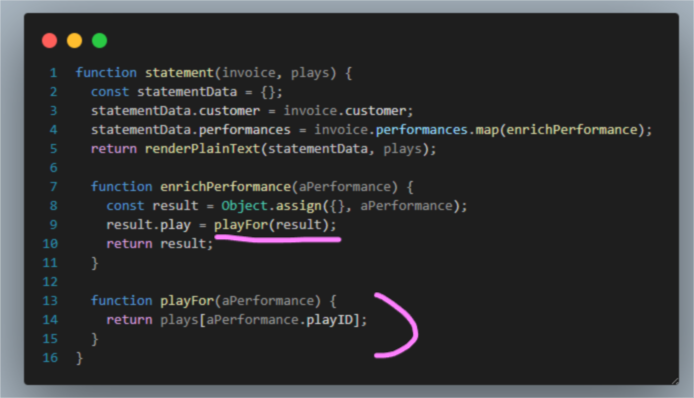 이를 위해 함수 옮기기(8.1절)를 적용하여 playFor() 함수를 statement()로 옮긴다.