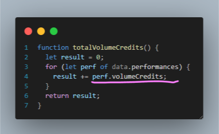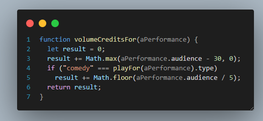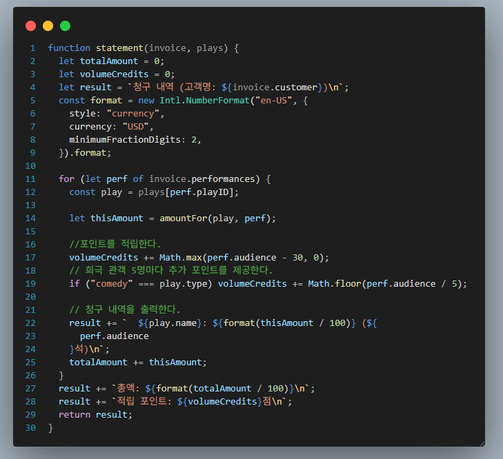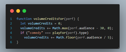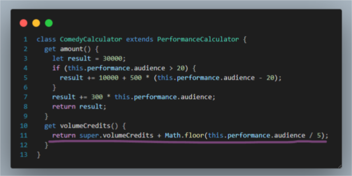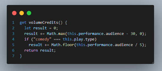 그리고 공연료와 별개로 포인트(volume credit)를 지급해서 다음 번 의뢰 시 공연료를 할인받을 수도 있다. 일종의 충성도 프로그램인 셈이다.