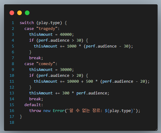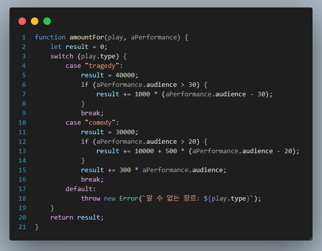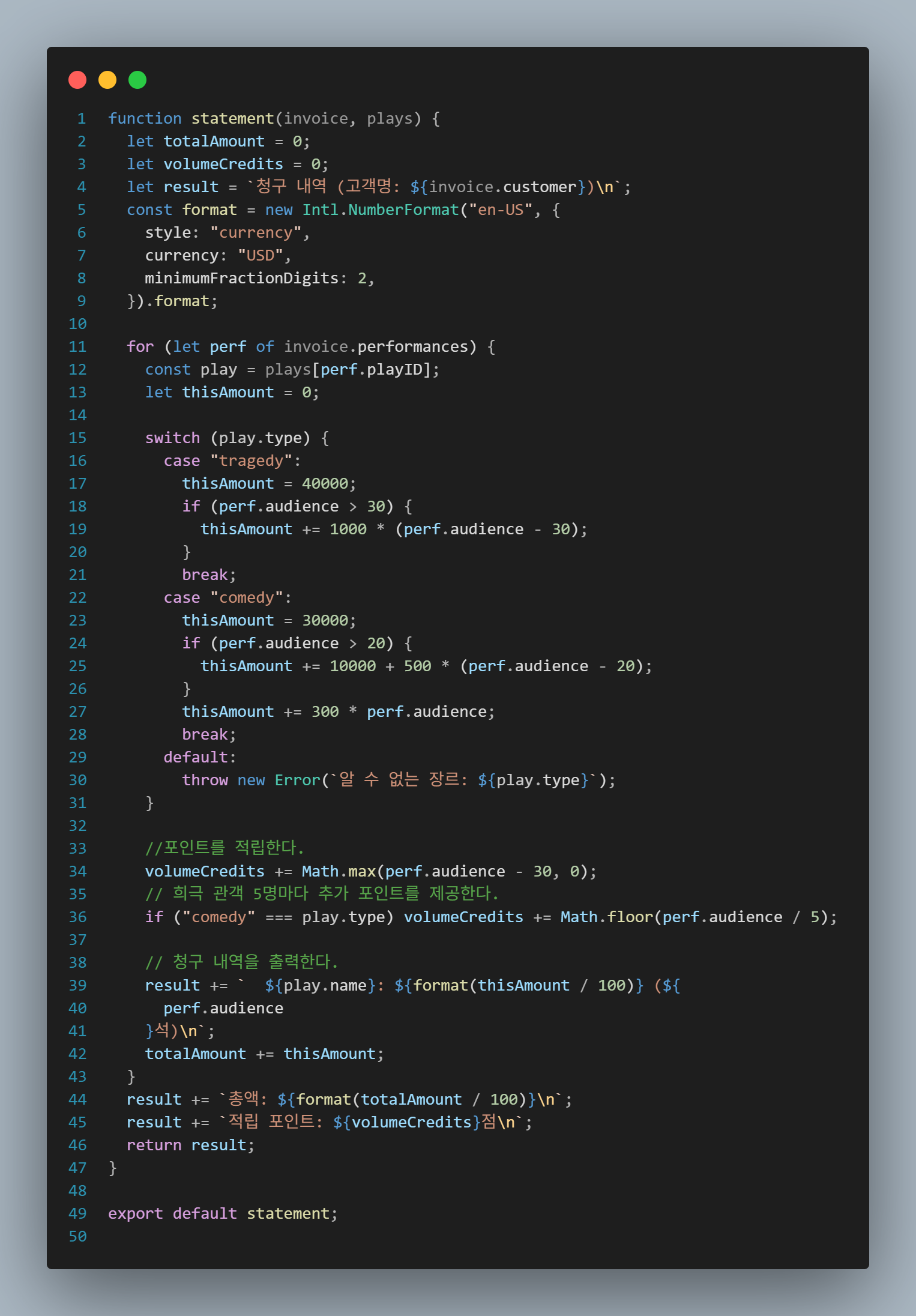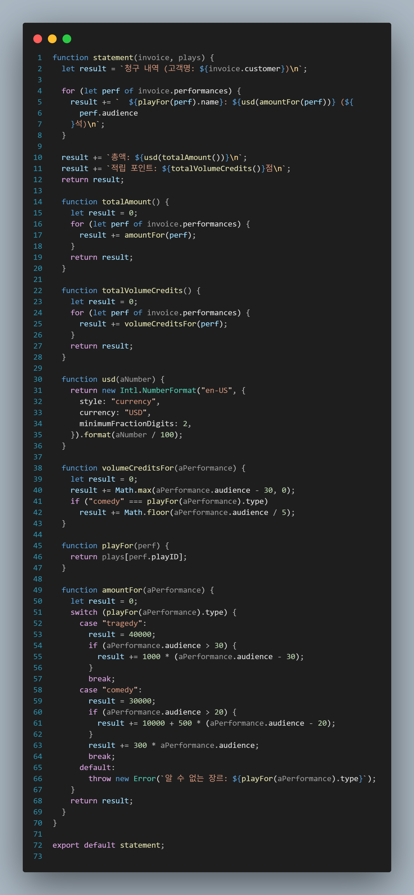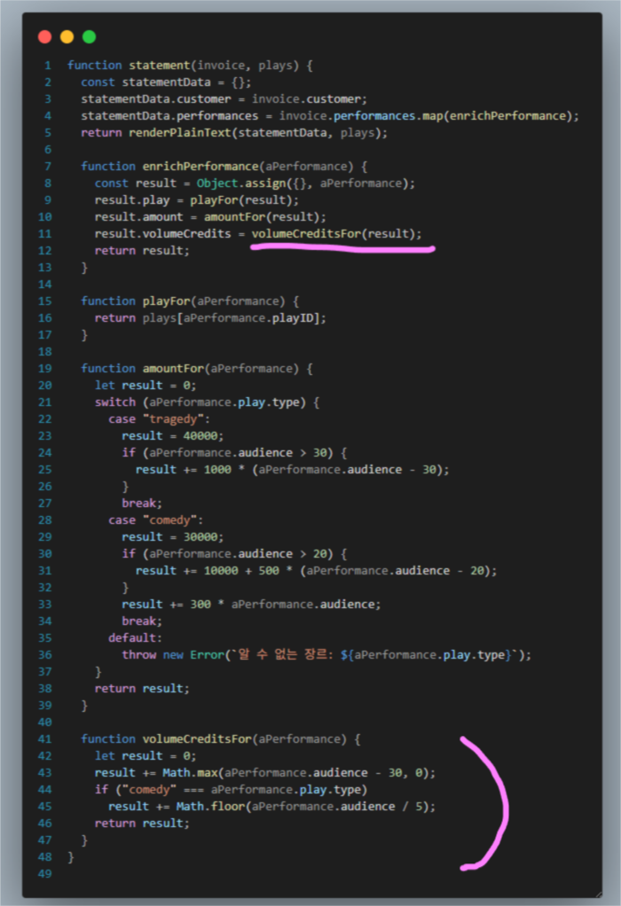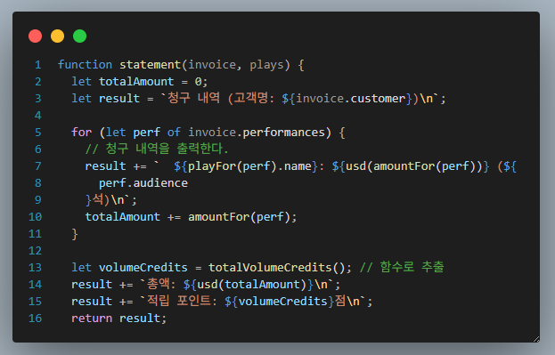 현재 이 함수는 조건부 로직을 포함한 함수인 amountFor()와 volumeCreditsFor()를 호출하여 공연료와 적립 포인트를 계산한다.