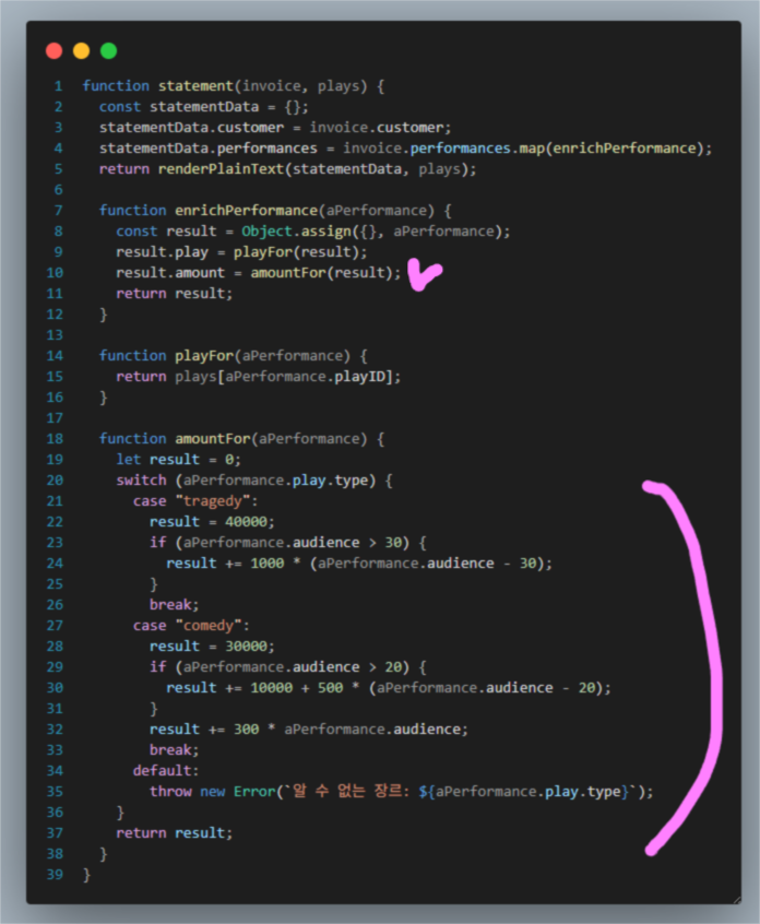 statement() 에 필요한 데이터를 먼저 처리하는 과정의 핵심은 각 공연의 정보를 중간 데이터 구조에 채워주는 enrichPerformance() 함수다.