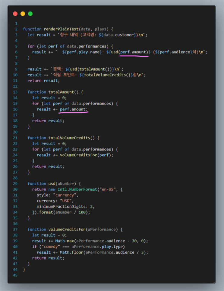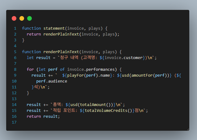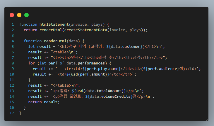 추가된 코드 덕분에 전체 로직을 구성하는 요소 각각이 더욱 뚜렷이 부각되고, 계산하는 부분과 출력 형식을 다루는 부분이 분리됐다.
