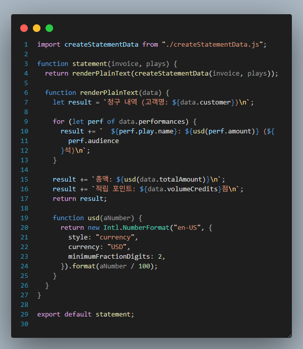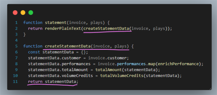 이 인수들을 통해 전달되는 데이터를 모두 방금 만든 중간 데이터 구조로 옮기면, 계산 관련 코드는 전부 statement() 함수로 모으고 renderPlainText()는 data 매개변수로 전달된 데이터만 처리하게 만들 수 있다.