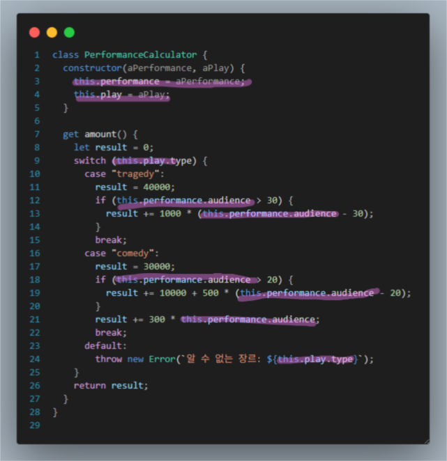 가장 먼저 할 일은 공연료 계산 코드를 계산기 클래스 안으로 복사하는 것이다.