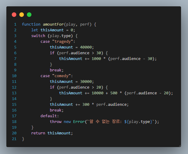 이러한 변수는 amountFor()안에서 다시 꺼내는 것이 좋다.