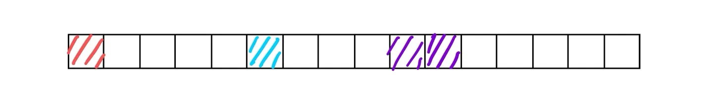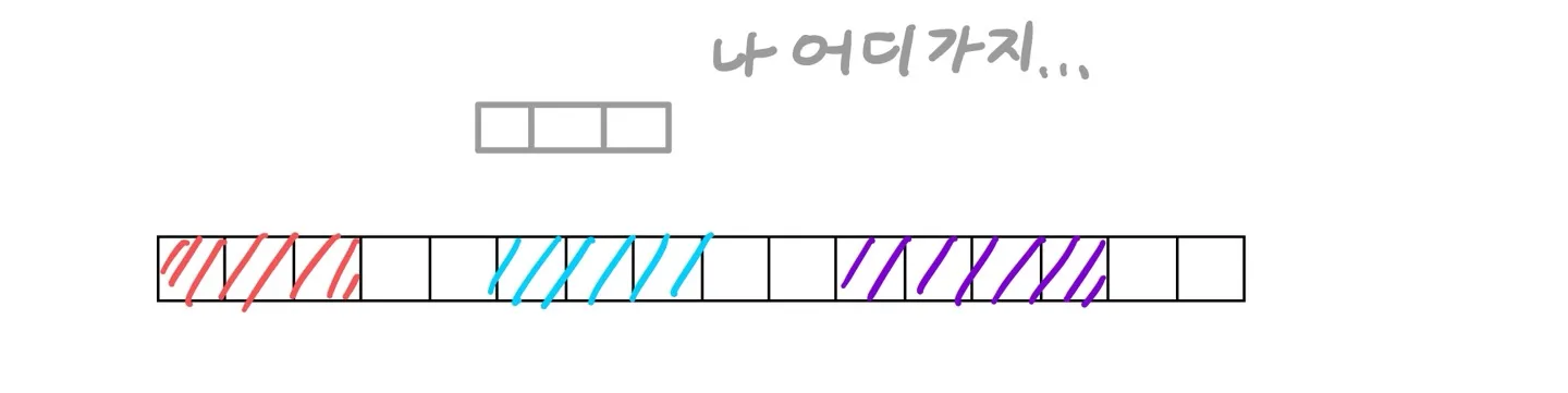 만약 여기서, 어떤 프로세스가 세 칸의 메모리에 대한 할당을 요청했을 때, OS는 해당 메모리를 위한 빈 공간을 어떻게 지정할 수 있을까?