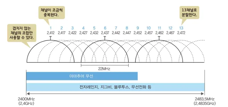 • 하지만, 각 채널의 주파수 대역이 미묘하게 겹치기 때문에, 보통 동시에 3개의 채널까지만 사용 가능하다.
