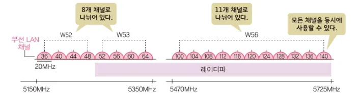 - 무선 랜은 크게 두가지 주파수 대역 중 하나를 사용한다.