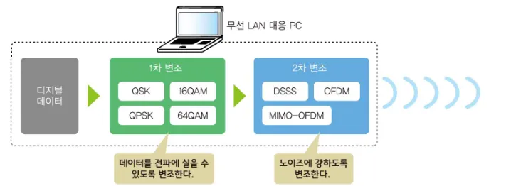 - 2차 변조 방식과 주파수 대역의 조합이 무선 LAN 프로토콜을 결정한다.