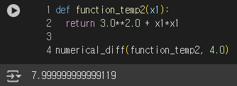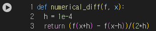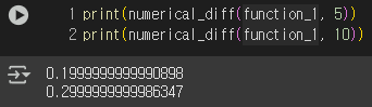 - 아주 작은 값을 주었을 때의 차분으로 미분하는 것을 수치 미분이라고 한다.