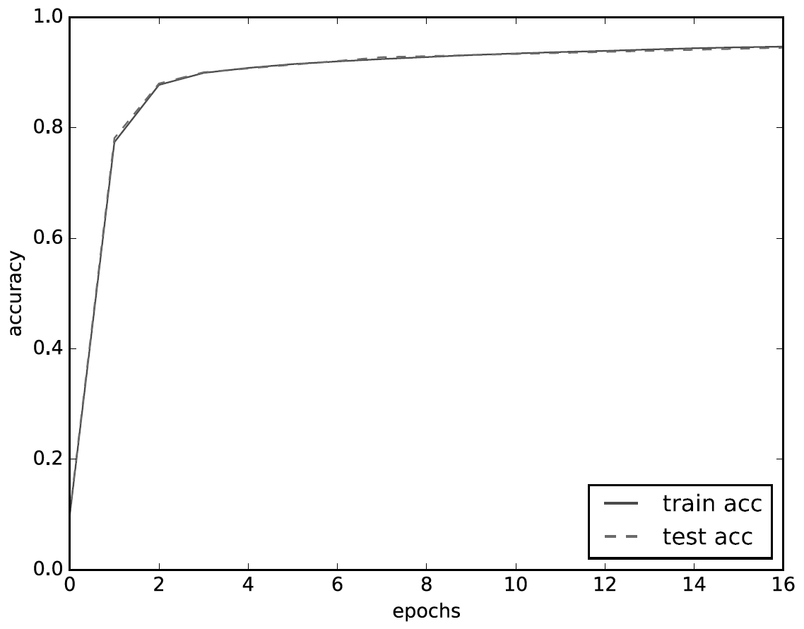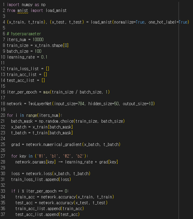 그럼 이제 2층 신경망을 대상으로 MNIST 데이터셋을 사용하여 학습을 진행해보자.