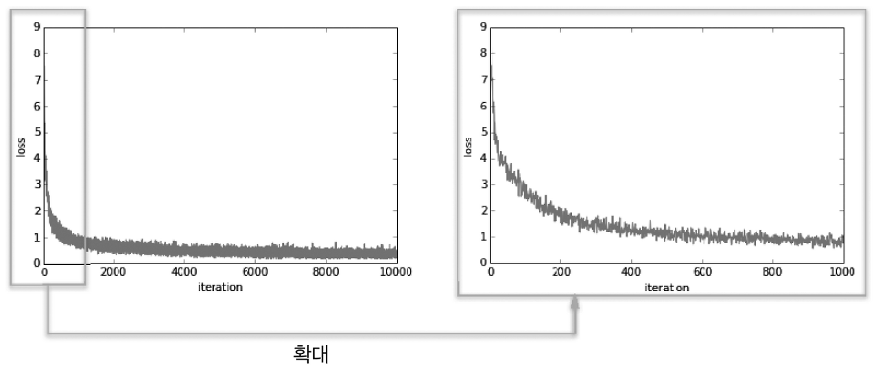 즉, 매번 6만개의 데이터에서 임의로 100개의 데이터를 추려내서, 해당 100개의 데이터로 SGD를 수행해 매개변수를 갱신했다.