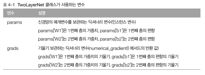먼저 아래와 같이 TwoLayerNet 클래스를 구현해보자.
