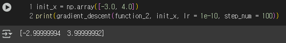 학습률을 0.0000000001로 지정하자, 초기 값인 (-3, 4)에서 크게 이동하지 않았다.