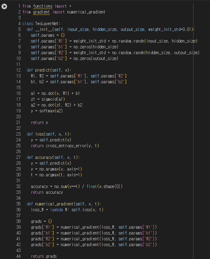 • 수치 미분과 오차역전파법의 결과를 비교하면 오차역전파법의 구현에 잘못이 없는지 확인할 수 있다(기울기 확인).