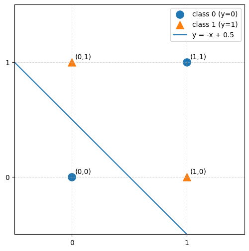이와 같은 접근을 "선형 분리" 라고 하며, 관련 내용은 "퍼셉트론 수렴 정리"를 참고해주시길 바랍니다.