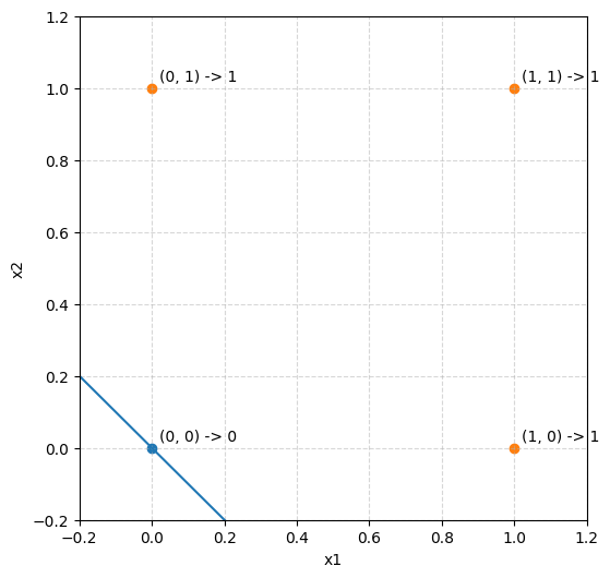 우리가 구현한 퍼셉트론에 우리가 구현한 OR 게이트를 대입하여 다시 살펴보자.