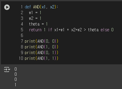 가령 (w1, w2, θ)가 (1, 1, 1)이면, x1과 x2가 모두 1일때만 AND 게이트의 조건을 만족한다.