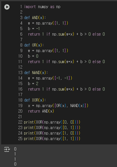 이로써 다층 퍼셉트론을 이용해 XOR 게이트를 구현할 수 있었고, 퍼셉트론의 비선형 영역으로의 확장 가능성을 살펴볼 수 있었다.