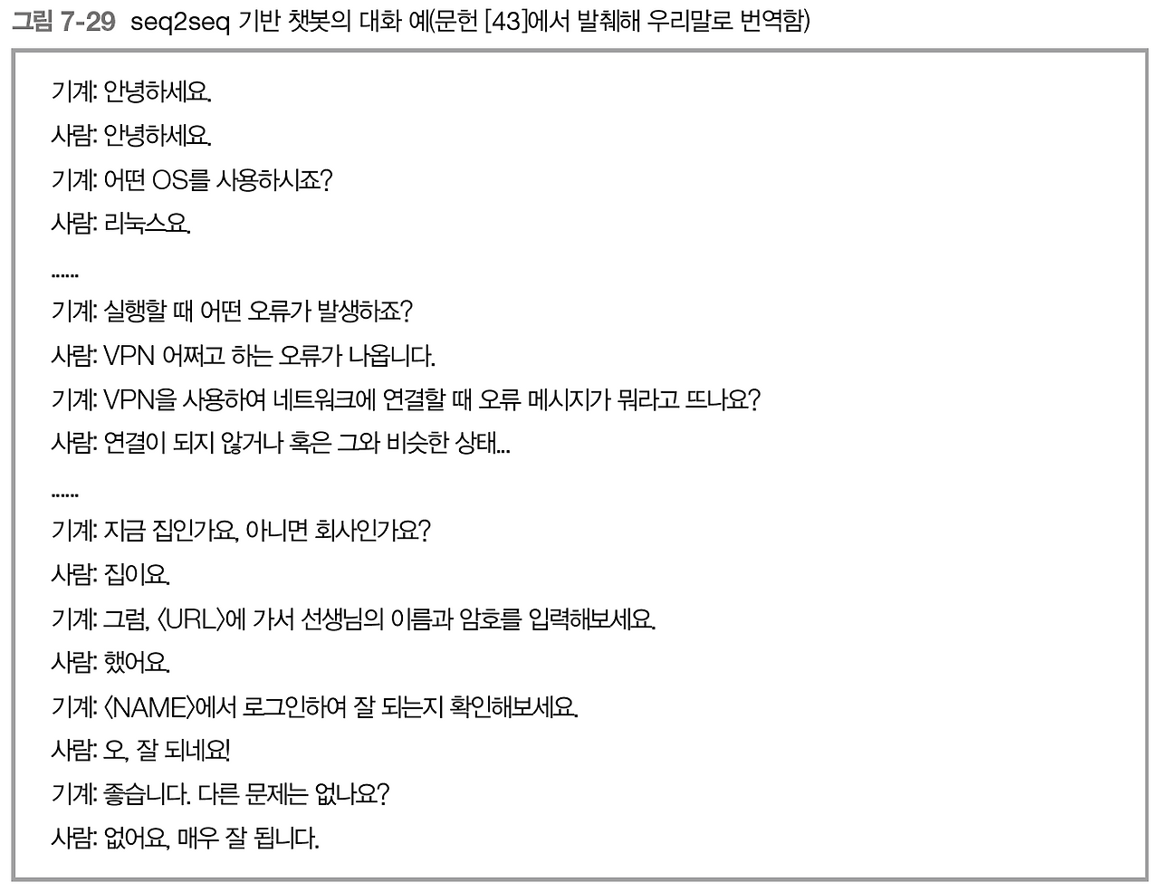 - 기계 번역, 챗봇, 이미지 캡셔닝 등 seq2seq는 다양한 애플리케이션에 이용할 수 있다.