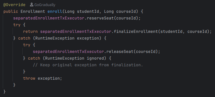 이 코드는 가장 락 경합이 심한 Course의 락 획득 시점을 최대한 뒤로 미뤄, Course의 락 점유 시간을 최대한 뒤로 미뤘다.