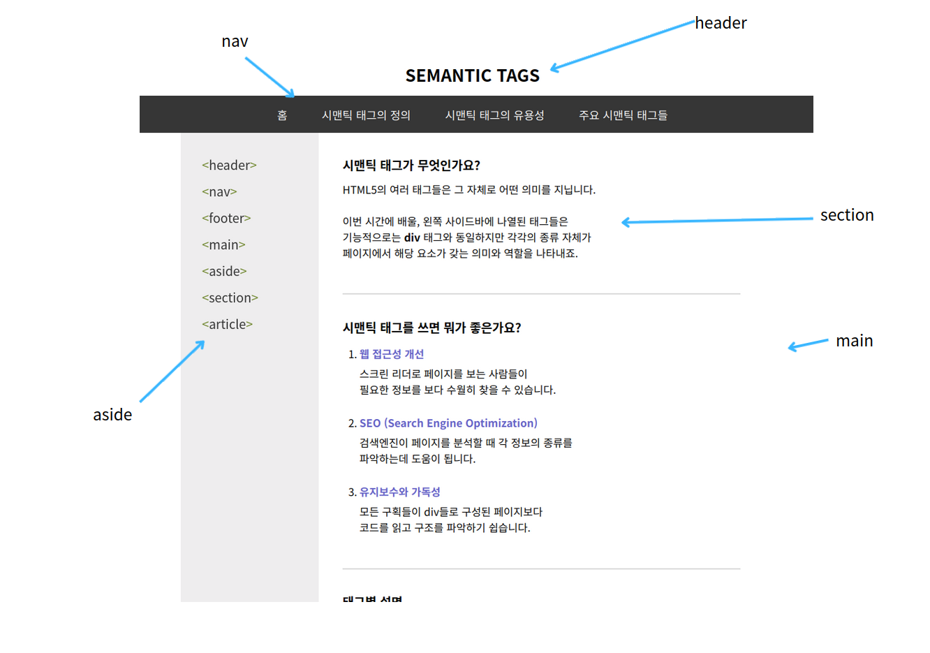 • 모든 구획들이 div들로 구성된 페이지보다 코드를 읽고 구조를 파악하기 쉽다.