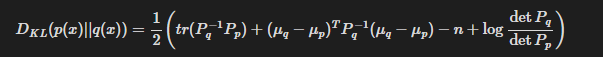 p(x)와 q(x)가 각각 평균이 mu_p, mu_q, 공분산이 P_p, P_q 인 n차원 가우시안 분포(다변량 정규분포)라면 KL 발산은 다음과 같이 계산된다.